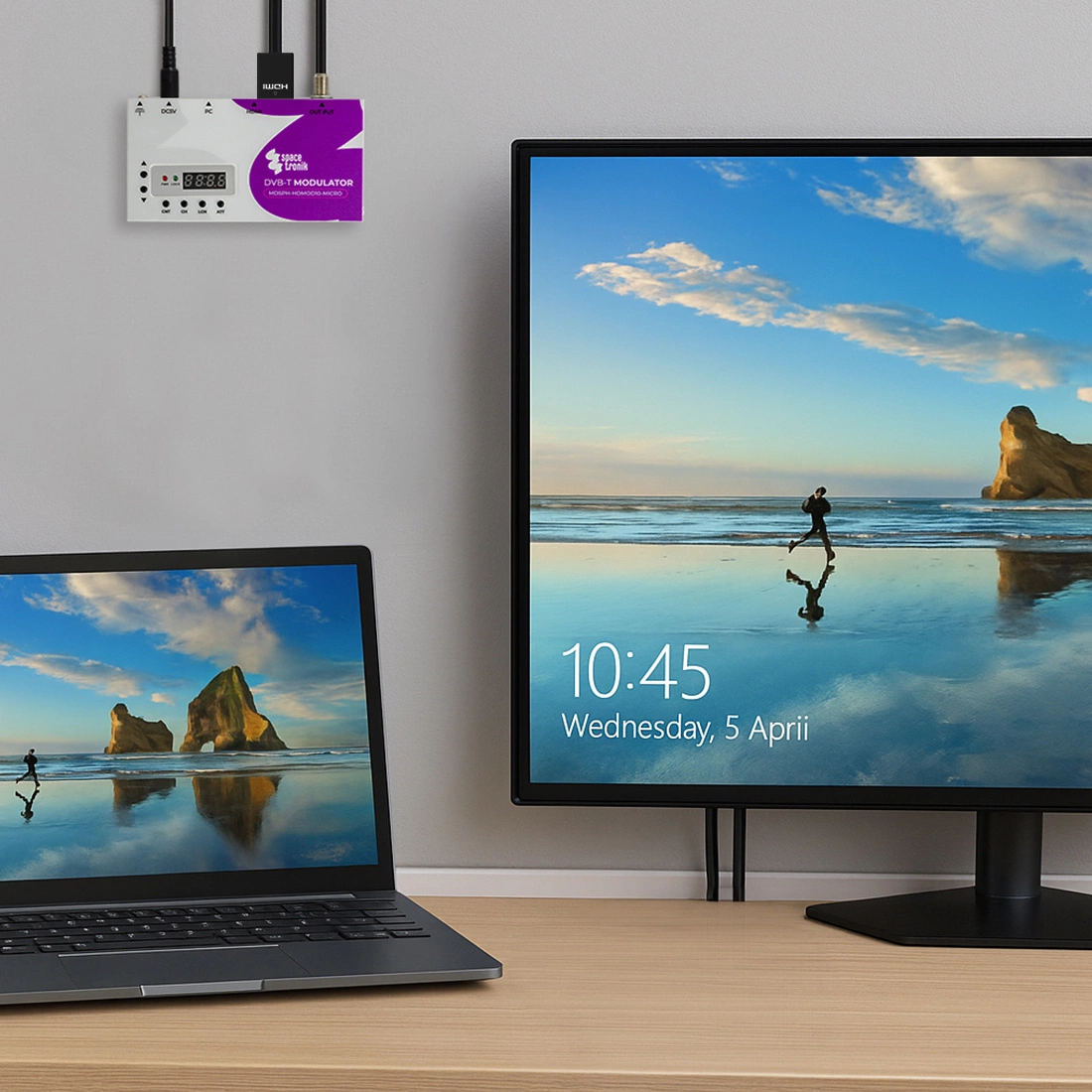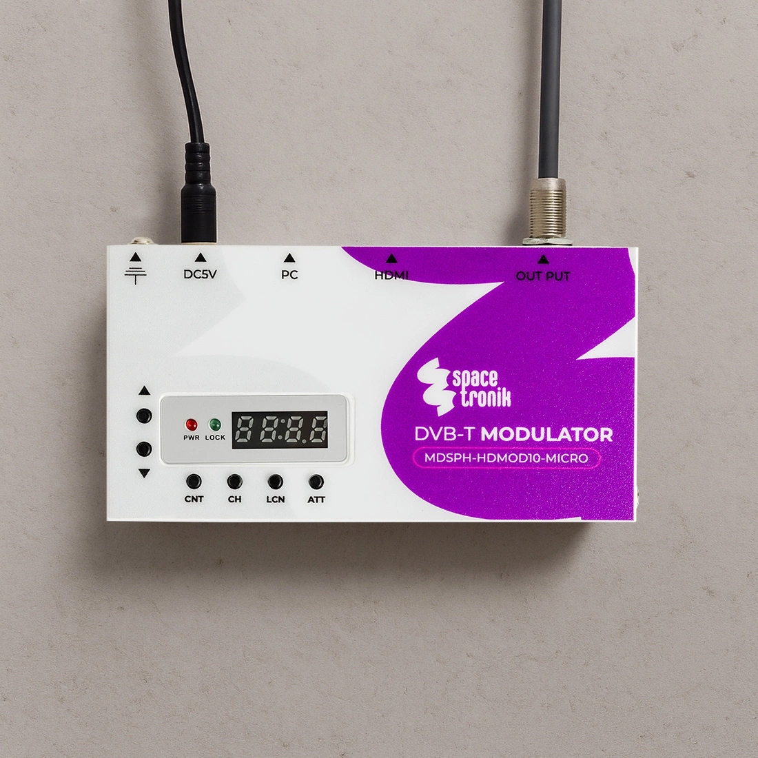 Der HDMOD Modulator wurde entwickelt, um digitales terrestrisches Fernsehen anzupassen. Er integriert MPEG-4-Kodierung und AVC/H.264-Modulation zur Umwandlung von Audio-/Videosignalen in einen RF DVB-T-Ausgang. Er ist ideal für die Übertragung von HD-Signalen von Satellitenempfängern, Camcordern oder Mediaplayern an einen Fernseher oder eine Set-Top-Box. Der Modulator verfügt über ein vierstelliges Display und sechs Tasten für eine intuitive Steuerung und Einstellung.