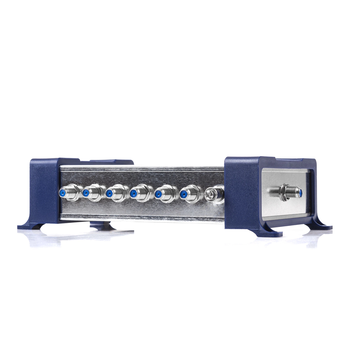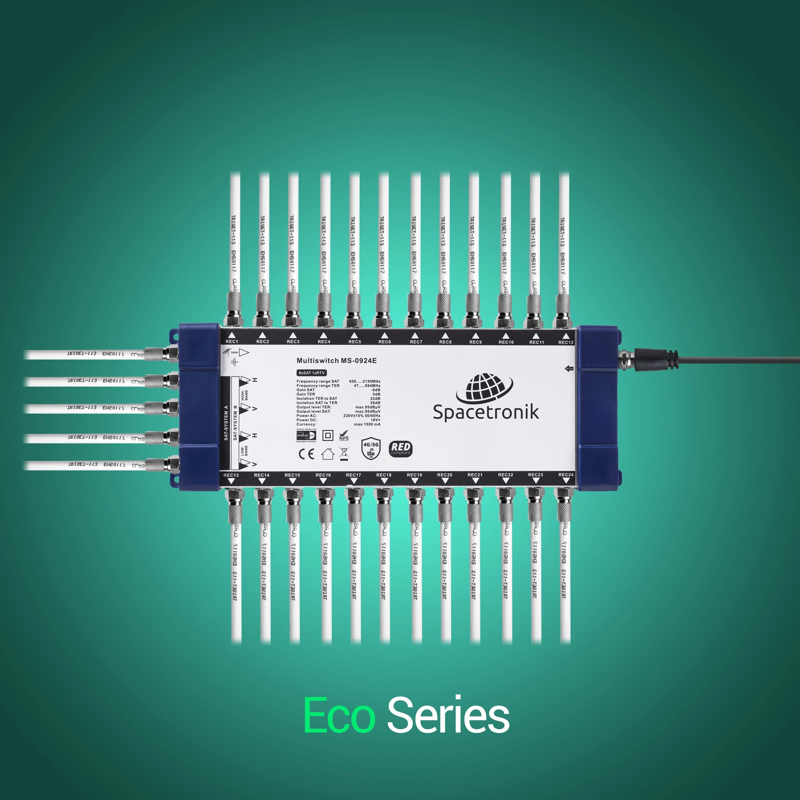 Die Installation des Spacetronik Multischalters in der Version Eco ist trivial. Auf der linken Seite des Multischalters befinden sich 4 Eingänge für Satellitensignale und 1 Eingang für Terriestal. Auf der rechten Seite befindet sich eine Stromeingangsbuchse. Die restlichen Elemente sind die Ausgänge für das kombinierte Signal - SAT + DVB-T/T2