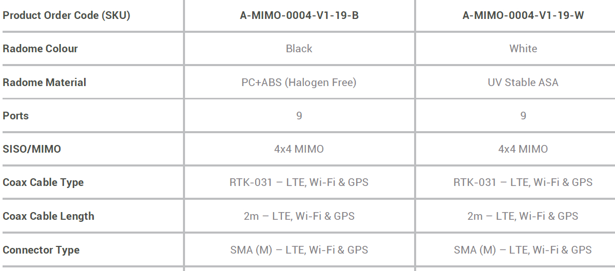 Die MIMO-4-19 ist eine leistungsstarke 9-in-1-Mehrfrequenzantenne in einem einzigen Gehäuse. Die Antenne bietet vier Mobilfunkverbindungen, zwei Wi-Fi-Verbindungen und eine GPS/GLONASS-Antenne. Die beiden MIMO-Mobilfunkantennen bieten eine Breitbandabdeckung von 617 bis 6000 MHz und decken damit die heutigen LTE/4G- und 5G-Bänder für zukünftige Anwendungen ab. Die Ultrabreitbandleistung der Mobilfunkantennen ermöglicht die Nutzung durch eine Vielzahl von Betreibern und Technologien und ist bereit für zukünftige Mobilfunktechnologien bis zu 6 GHz für 5G-Anwendungen sowie Wi-Fi-Anwendungen von 5 bis 6 GHz.