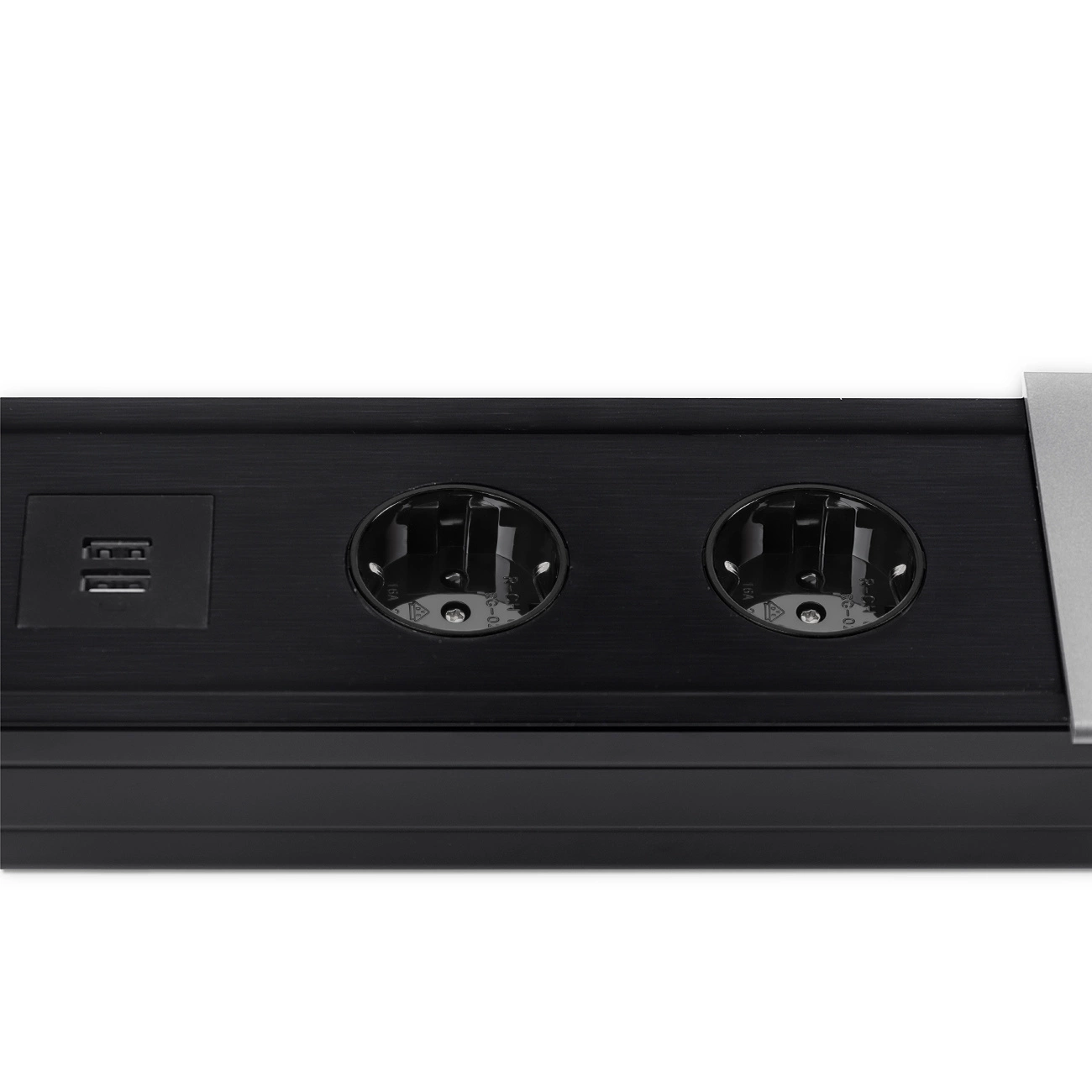 • Eleganter, auf der Arbeitsplatte montierter, verschiebbarer Mediaport. Mit 2 Steckdosen (Schuko) und einem doppelten USB-Ladegerät. Kabellänge 1,5 m. In Silber.