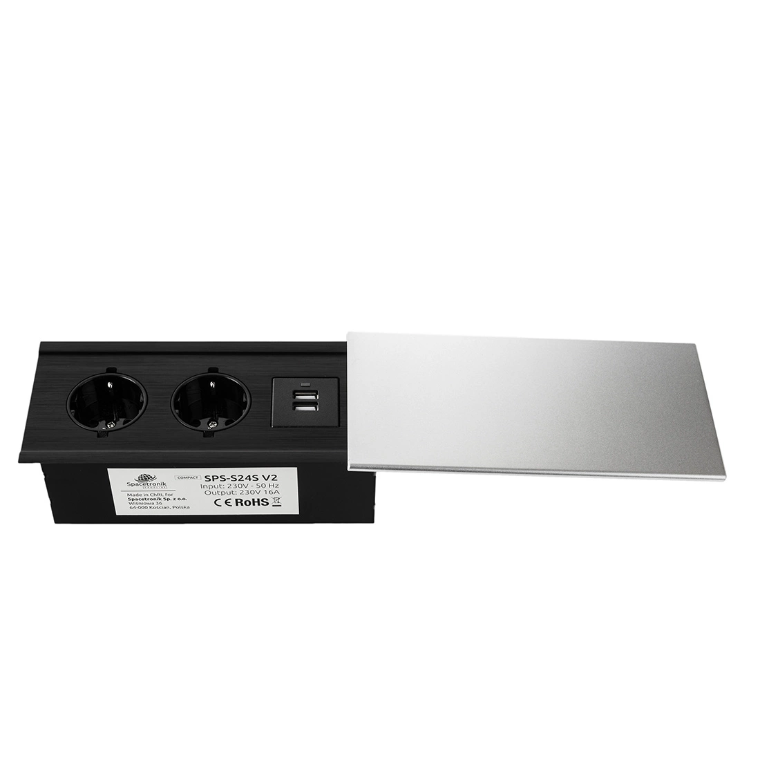 Spacetronik Ergoline Tisch-Mediaports sind eine moderne Lösung, die in Geschäften, Ausstellungsräumen, Konferenzräumen, Büros und auch zu Hause eingesetzt wird. Die Spacetronik SPS-S24S V2 COMPACT ist eine kleinere Version des Basismodells. Die Möbelsteckdose ist aus Aluminium und hochwertigen Komponenten gefertigt. Das Produkt ist für die Innenmontage in Schreibtischen, Arbeitsplatten und Tischen konzipiert. Die Einbausteckdose ist mit 2 Schuko-Steckdosen 110-250 V (deutsch/kein Pin) und einem Doppel-USB-A-Ladegerät ausgestattet.