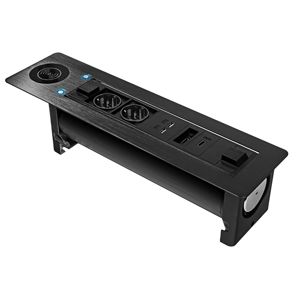 Der elektrische Mediaport SPS-E27B V2 von Spacetronik ist eine hochmoderne Lösung, die in Geschäften, Ausstellungsräumen, Konferenzräumen, Büros und auch zu Hause eingesetzt wird. Mit einem einzigen Knopfdruck decken sich die Steckdosen nahtlos auf. Er ist aus Aluminium und hochwertigen Komponenten gefertigt. Das Produkt ist für die Innenmontage in Schreibtischen, Arbeitsplatten und Tischen konzipiert, entweder vertikal oder horizontal, und bietet Zugang zu Steckdosen. Der Mediaport ist mit 2 Steckdosen 110-250 V (Typ Schuko), einem dualen USB-Ladegerät, HDMI 2.0, USB 3.0 und einem induktiven Ladegerät zum kabellosen Aufladen Ihres mobilen Geräts ausgestattet.
