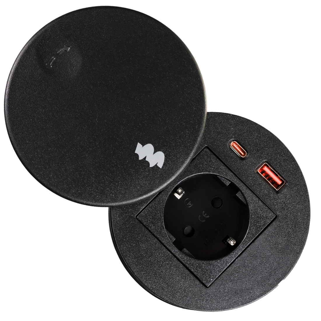 Runde Tischsteckdose mit Abdeckung ERGOLINE SPS-R1D3B V2 (schwarz)