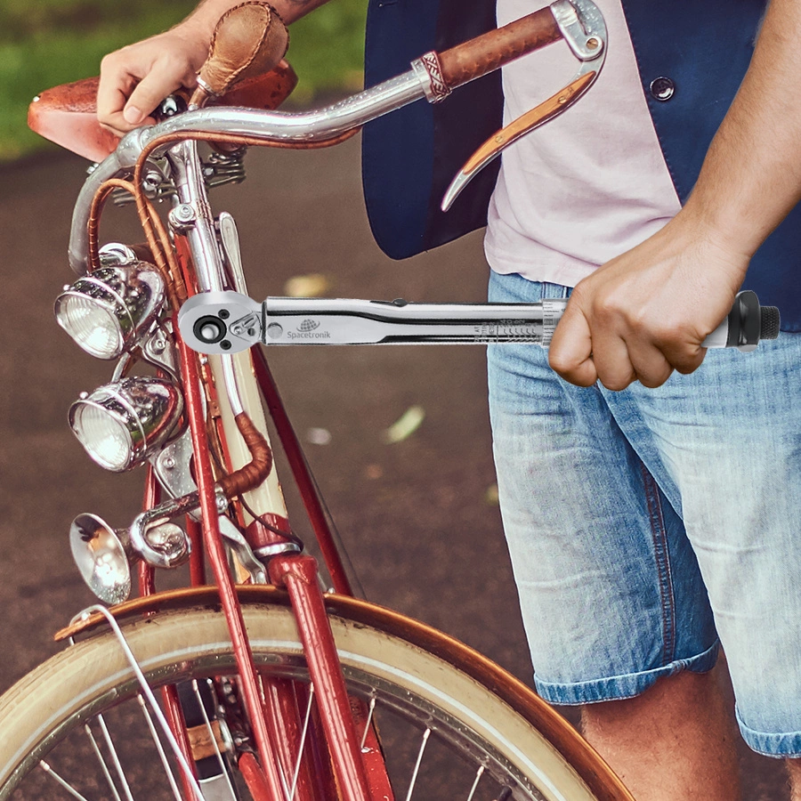 Der Spacetronik-Drehmomentschlüssel SPM-T19 ist einWerkzeug für Profis und Hobbyschrauber, die Wert auf Präzision bei ihrer Arbeit legen. Er ist ideal für den Fahrradservice, wo die Genauigkeit beim Anziehen von Schrauben und Bauteilen entscheidend für Sicherheit und Produktivität ist. Mit einem Bereich von 2-24 Nm und einer Arretierungseinstellunghat der Benutzer die volle Kontrolle über das Drehmoment, was bei empfindlichen Komponenten wie Carbonteilen oder feinmechanischen Teilen von unschätzbarem Wert ist.