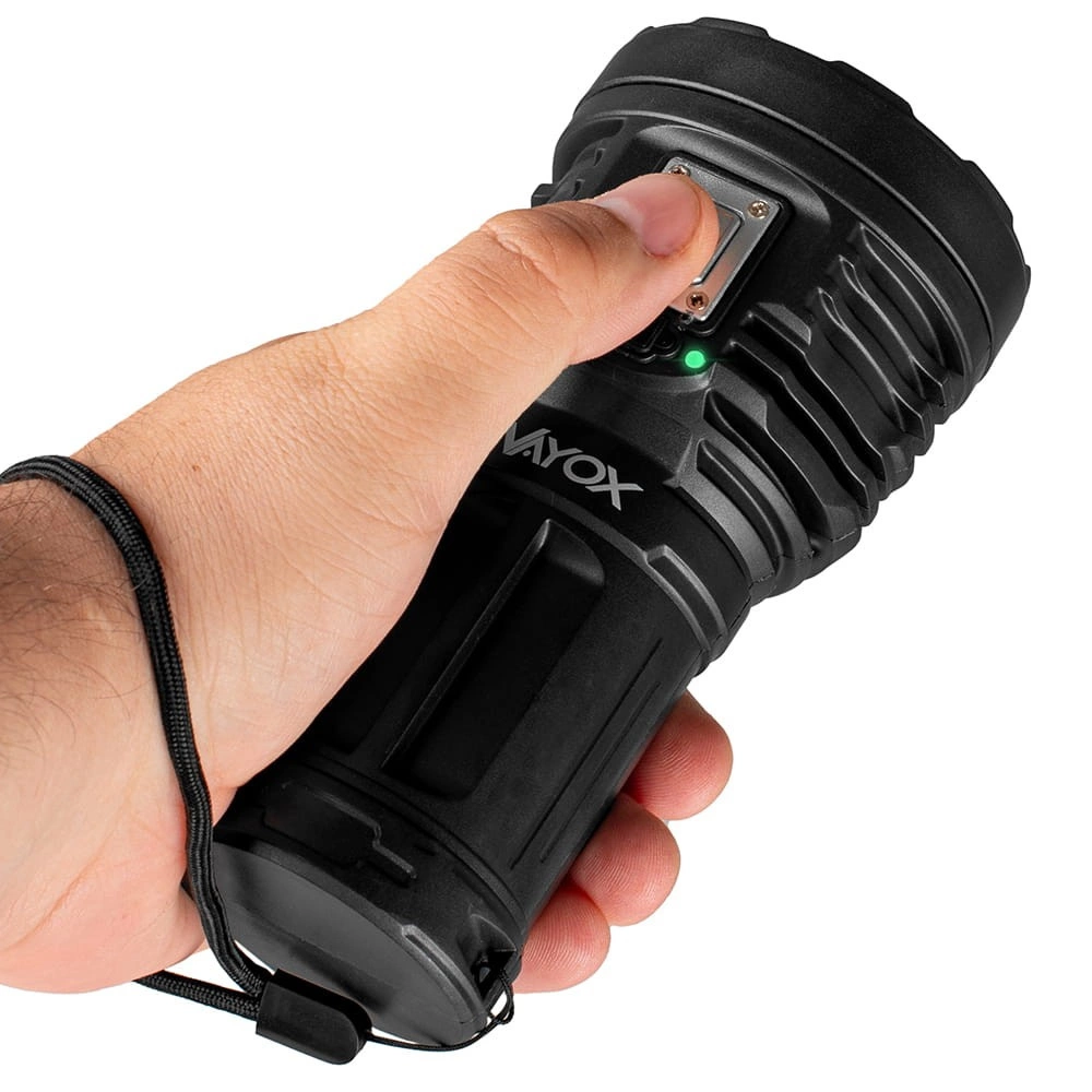 Beim ersten Drücken des Schalters leuchtet die Taschenlampe mit einem fokussierten Lichtstrahl von 600 Lumen und ist damit ideal für die Ausleuchtung weiter entfernter Räume. Die Seitenleuchte mit 120 Lumen leuchtet mit einem breiteren Strahl - geeignet zum Lesen, als Werkstatt- oder Tischleuchte. Die Modi werden durch Drücken des Schalters umgeschaltet.