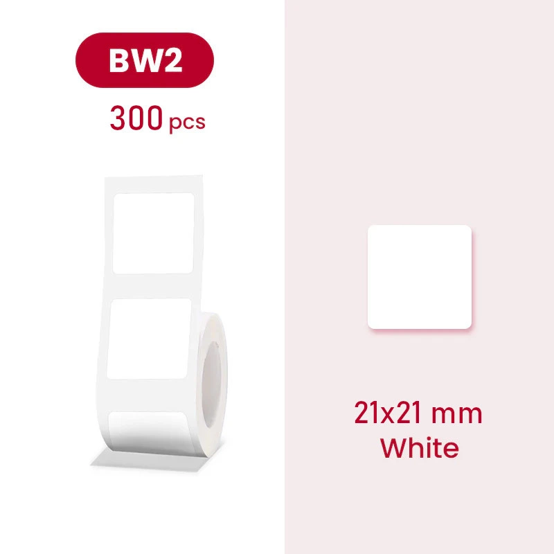 Etiketten für Drucker der Niimbot B-Serie in weiß. Es sind 300 Stück auf einer Rolle in der Größe 21x21mm. Quadratische Etiketten.