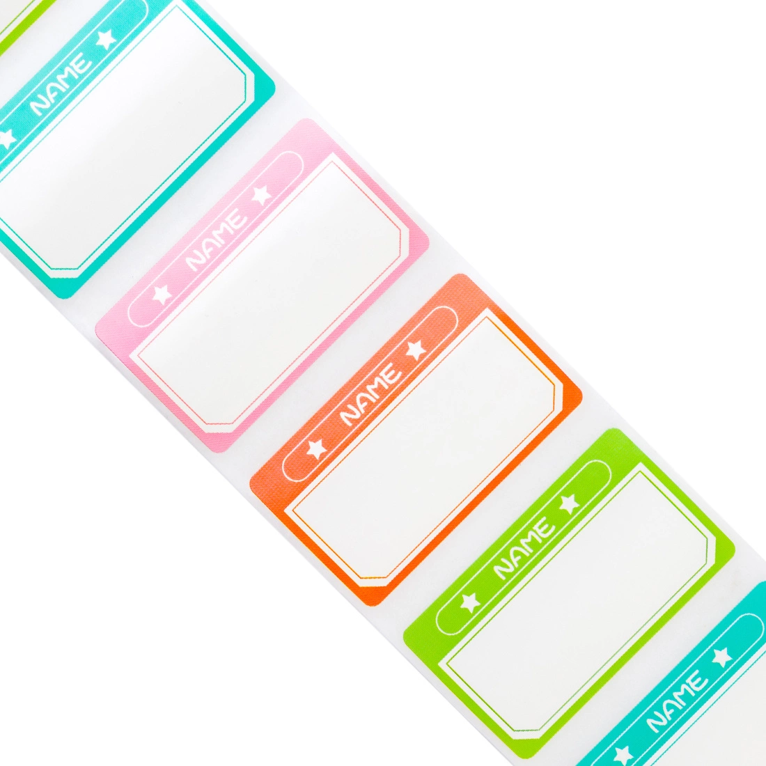 Mehrfarbige Etiketten mit der Überschrift "Name" für Drucker der Niimbot B-Serie. Es sind 230 Stück auf einer Rolle im Format 50x30mm. Etiketten in horizontaler (liegender) Position.