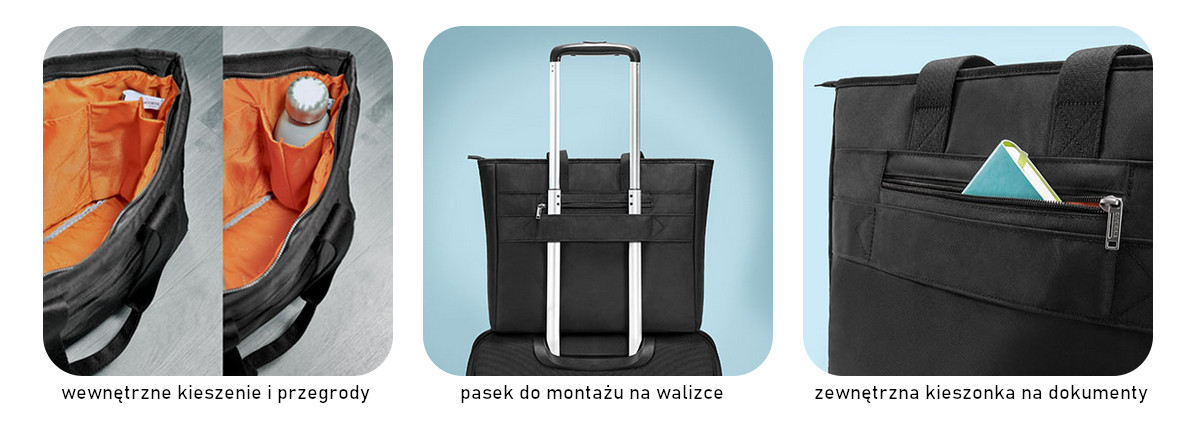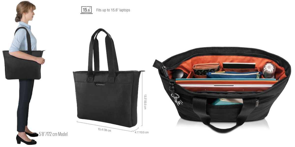 EVERKI Shopper jest to idealna torba dla osób w ruchu. Do torby z łatwością zmieści się laptop do 15,6". Wnętrze wyściełane jest wyjątkowo miękkim i eleganckim materiałem. Przestronna komora główna do przechowywania oferuje przekładki do utrzymywania dokumentów lub urządzenia peryferyjne oddzielone w miękkiej kieszeni która jest idealna dla iPad-a, Kindle lub innego tabletu gdzie urządzenie będzie bezpieczne. Przednia kieszeń posiada wiele szczelin na przechowywanie wizytówek, długopisy, oraz inne ważne dokumenty.