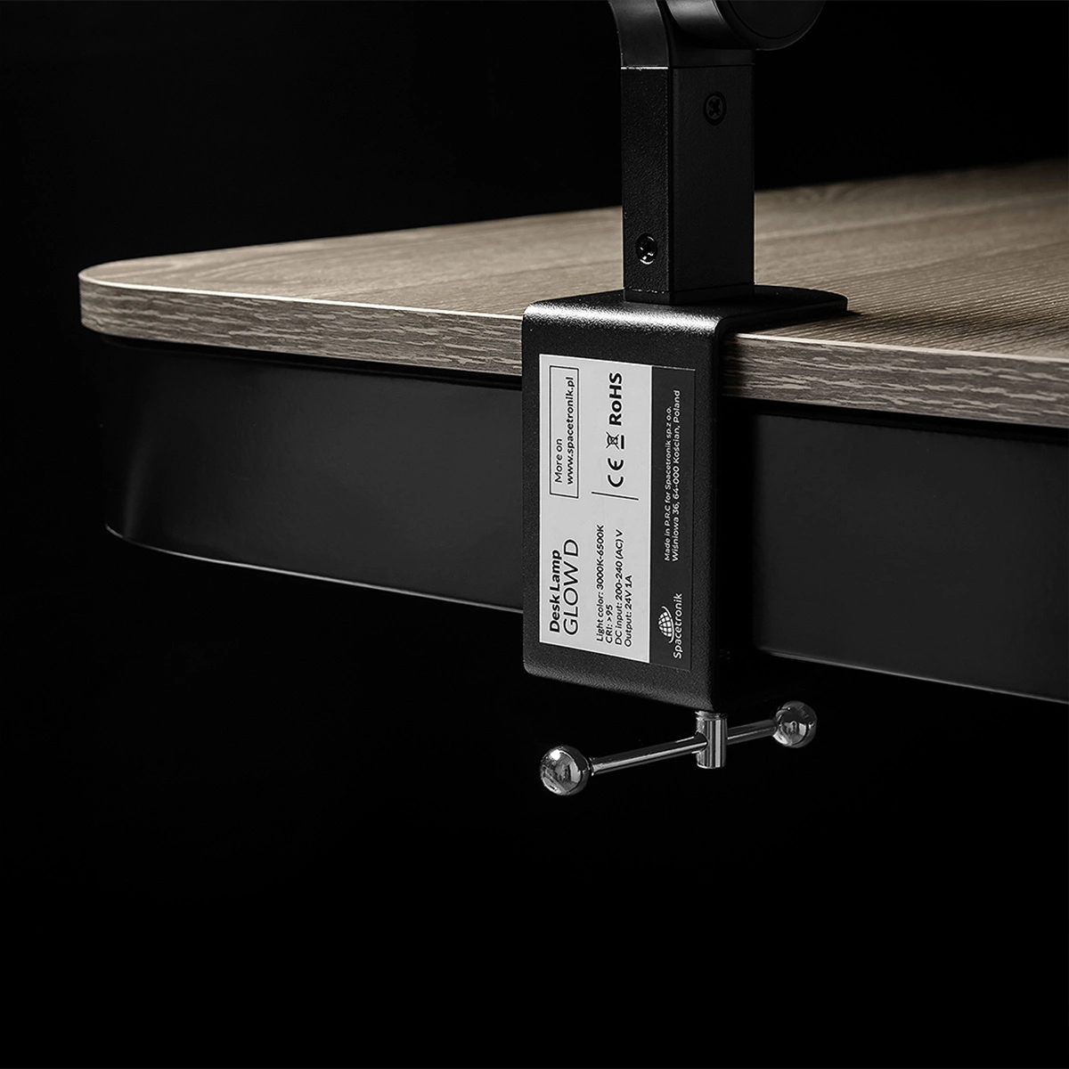You don't have to be an expert to mount the Spacetronik Glow lamp on your desk. Thanks to a simple screw clamp mounting system, installation is quick and hassle-free. Simply attach the lamp to the edge of a tabletop up to 63 mm thick, and a sturdy metal screw will ensure the stability of the entire structure. Additional rubber pads protect the surface of the desk from scratches, so you do not have to worry about damage to your furniture. This practical solution allows you to securely mount the lamp on almost any flat surface, giving you full freedom in arranging your workspace.