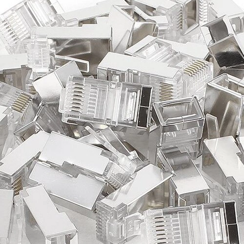 • High quality RJ45 pass through plugs. RJ45 Pass Through Category 5 (CAT5E) plug in transparent color, shielded (FTP). Metal housing. Price is for 25 pcs.