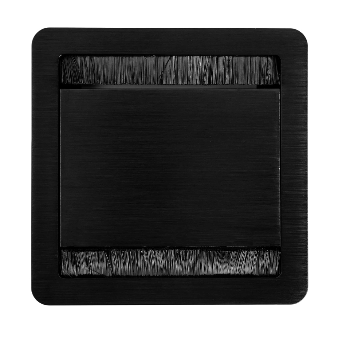 • Double-sided cable grommet 15x15 cm for routing cables through countertops and furniture. Keep your wiring neat and tidy. Aesthetically pleasing addition to your furniture. Features a sliding cover and a synthetic bristle grille. In black.