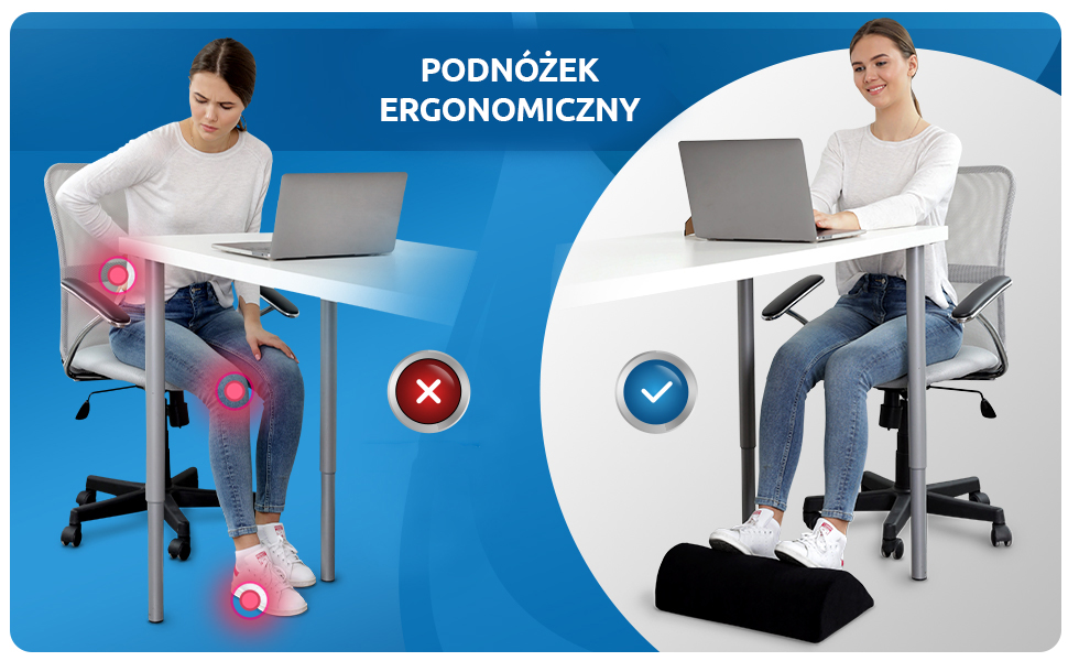 Ułożenie stóp na miękkiej poduszce to ulga dla mięśni nóg. Właściwa pozycja ciała w pozycji siedzącej to podstawowy nawyk, który powinnna wyrobić sobie każda osoba spędzająca dzień w pracy przy biurku. Dzięki umieszczeniu nóg na podnóżku poprawi się krążenie krwi i już nigdy nie będziesz mieć problemu z cierpnącymi stopami czy kurczami.