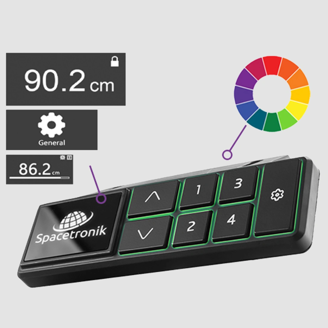 Spacetronik SPE-231OB electrically adjustable rack is equipped with a controller with conveniences. Make changes, save settings on the easy-to-read OLED display. Adjust the height with the "up" and "down" buttons and observe the current position on the OLED screen. Save up to four selected height settings and return to them in the future. The desk allows you to lock the controller, for example, against unwanted use by children. The space around the buttons is illuminated with several alternating colors or a choice of 6 colors.