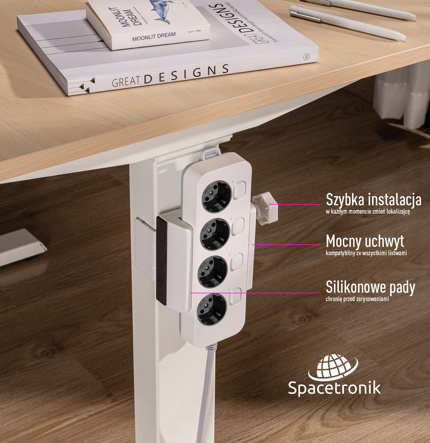 Uchwyt listwy zasilającej służy do zapewnienia wygody użytkownikom poprzez zwiększenie porządku woków biurka. Jest to szczególnie przydatne, gdy chcemy podłączyć urządzenie- nie musimy schylać się pod biurko w celu znalezienia przedłużacza. Takie rozwiązanie pozwala także na lepszą organizację kabli i sprawdzi się w przypadku biurek z regulacją wysokości.