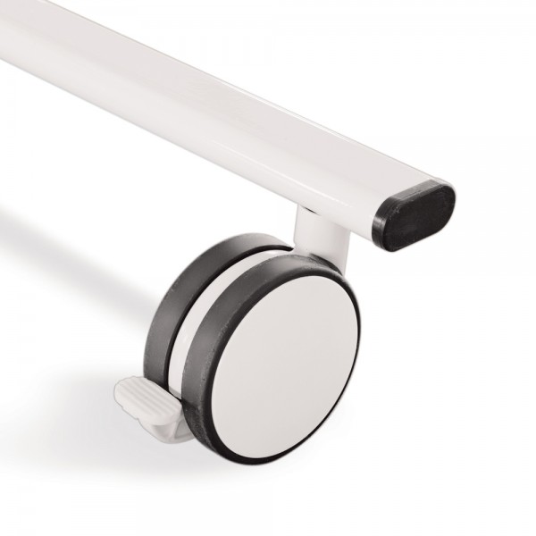 Mobilny stojak do tablicy zawiera kółka, które umożliwiają transport stelaża z tablicami. Posiadają one zabezpieczenie, które pozwoli na blokadę, aby tablica nie przemieszczała się swobodnie wtedy, kiedy potrzebujemy, aby stała w miejscu.