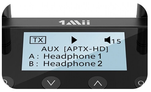 Nadajnik 1Mii B03+ został wyposażony w wyświetlacz LCD dzięki któremu możesz odczytać oraz wybrać właściwe urządzenie Bluetooth z którym chcesz się sparować. Dodatkowo wyświetlą się format audio, użyte kodeki oraz głośność.