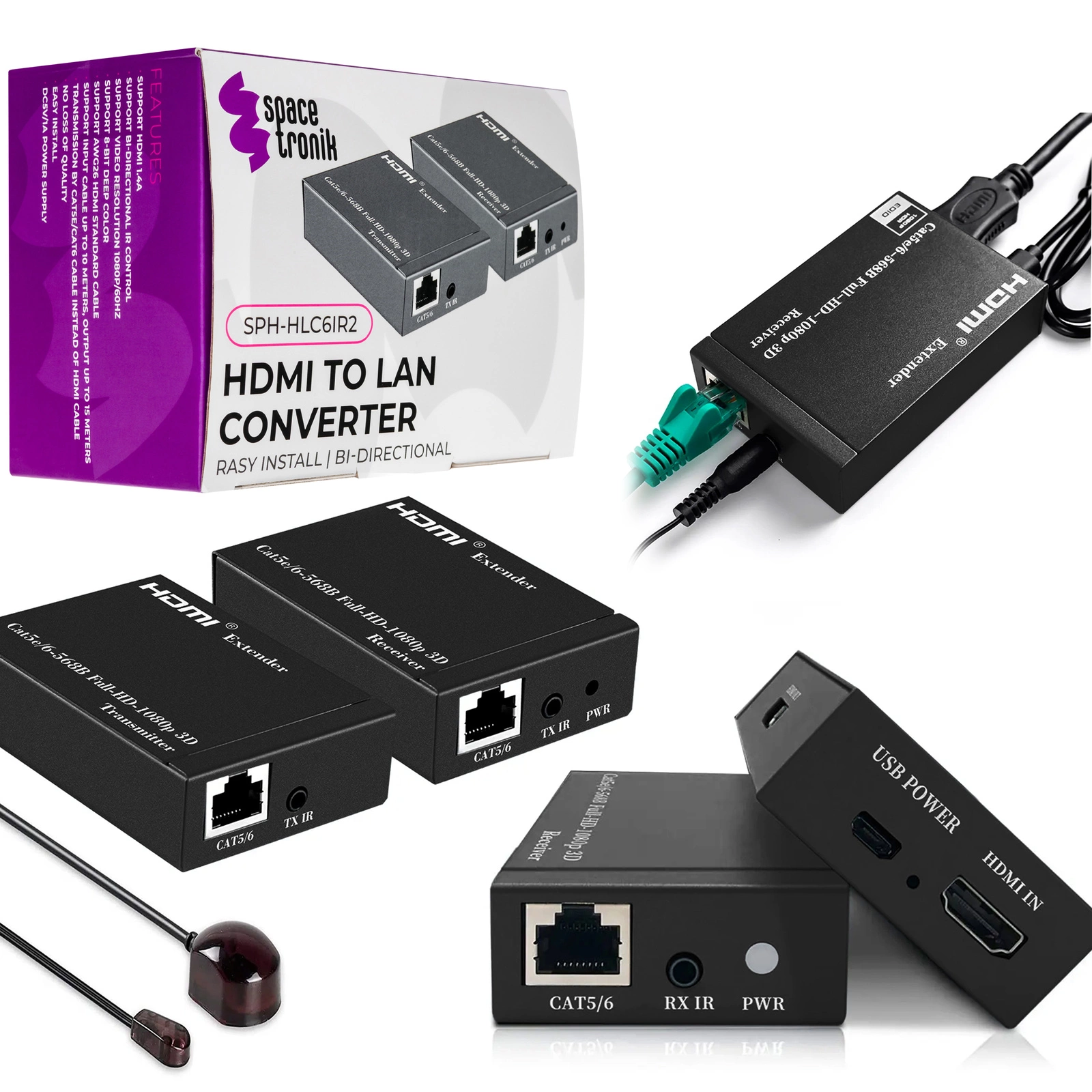 Przedłużacz sygnału HDMI Spacetronik SPH-HLC6IR2. Urządzenie umożliwia podłączenie sygnału wysokiej rozdzielczości (HD) do odbiornika (telewizor, monitor, itp.) wyposażonego w złącze HDMI poprzez skrętkę komputerową kat. 6 lub wyższej. W zestawie znajduję się nadajnik (TX) oraz odbiornik (RX). Dodatkową zaletą urządzenia jest przesyłanie funkcji pilota za pomocą dołączonych podczerwieni IR.