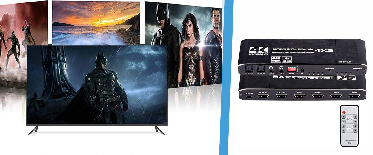 Matrix HDMI 4x2 może łączyć 4 źródła sygnału HD z 2 wyświetlaczami HD, dodatkowo urządzenie posiada wyjście toslink lub słuchawek stereo. Matrix umożliwia łatwe przełączanie lub podział dwóch urządzeń HDMI na dwa monitory lub projektory zgodne z HDMI. Porty wyjściowe mogą realizować niezależne wyjście audio przez stereofoniczny zestaw słuchawkowy. Urządzenie idealnie sprawdza się w zakresie kontroli centrum danych, dystrybucji informacji, prezentacji na sali konferencyjnej, środowisk szkolnych i szkoleniowych.