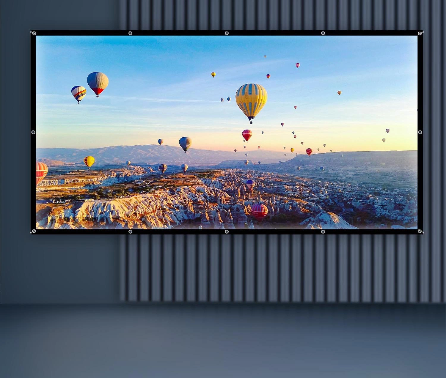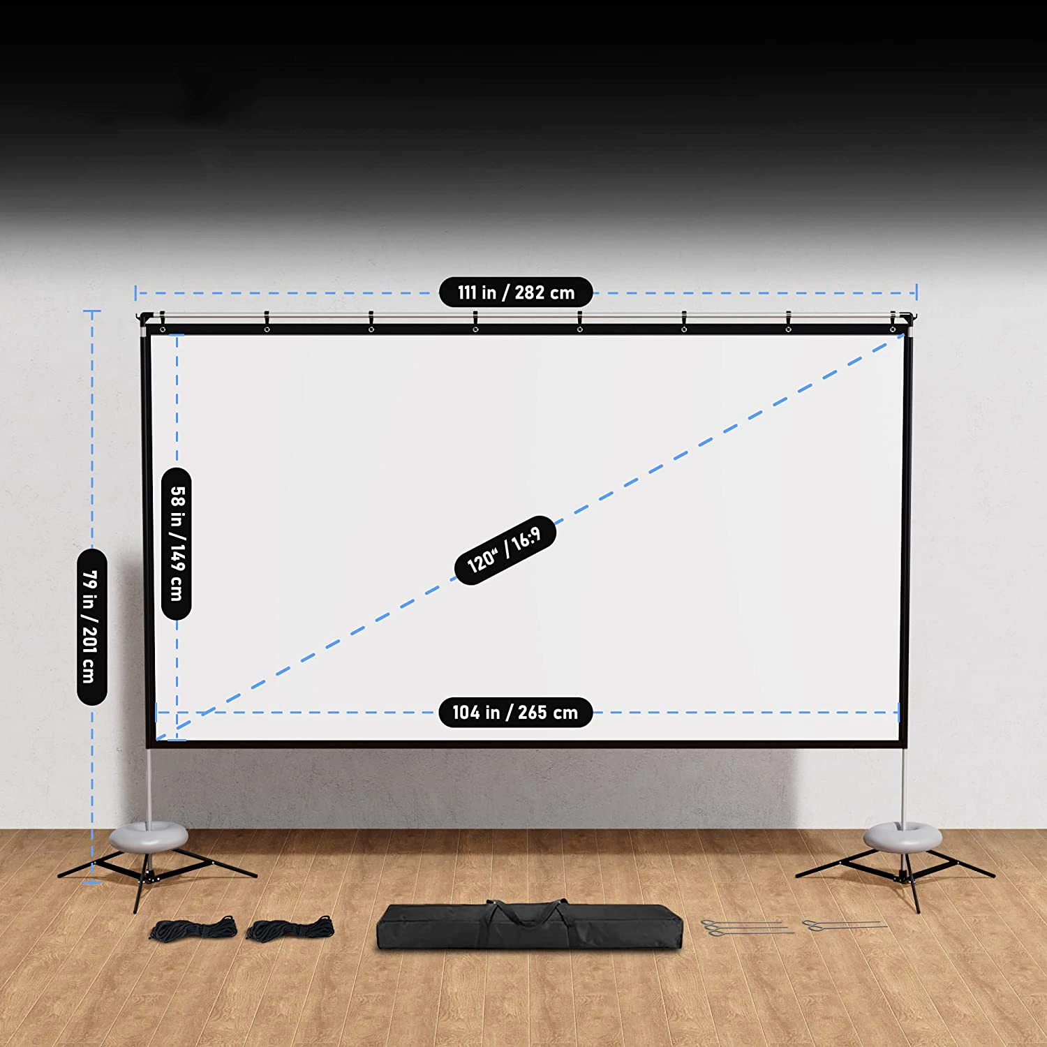 Quickly foldable 120" double foot projection screen provides a perfect image. The projection screen is made of high-quality polyester and spandex material. It offers sharp, high-resolution images and even supports front and rear projection. You can mount the projection screen on the wall with a peel-and-stick and hooks, or stand it on the frame that is included. The screen is lightweight and can be folded into the included storage bag, so you can enjoy a movie anywhere.