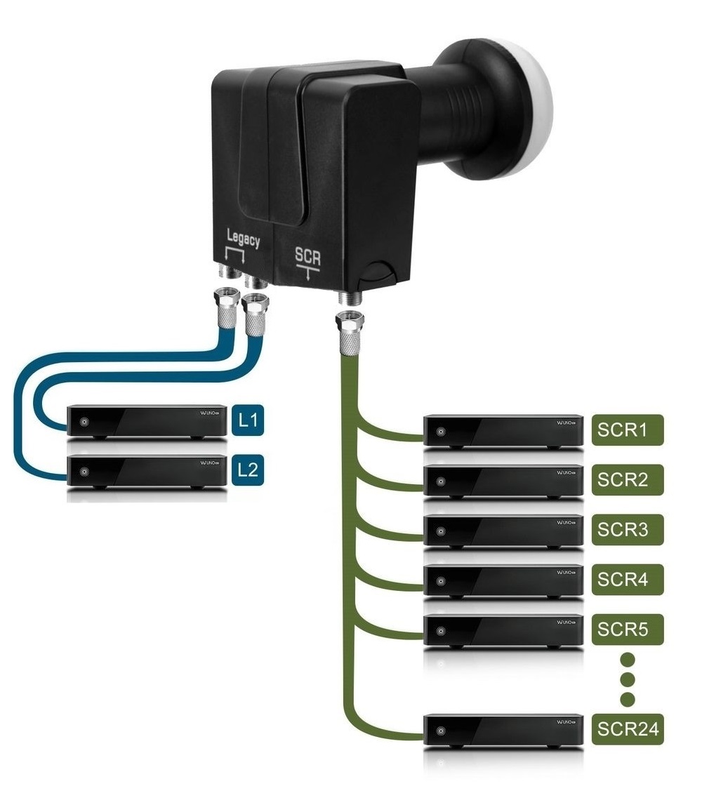 - 1x wyjście SCR dla maksymalnie 24 odbiorników na jednym kablu koncentrycznym (musi być zgodne ze standardem SAT-SCR)