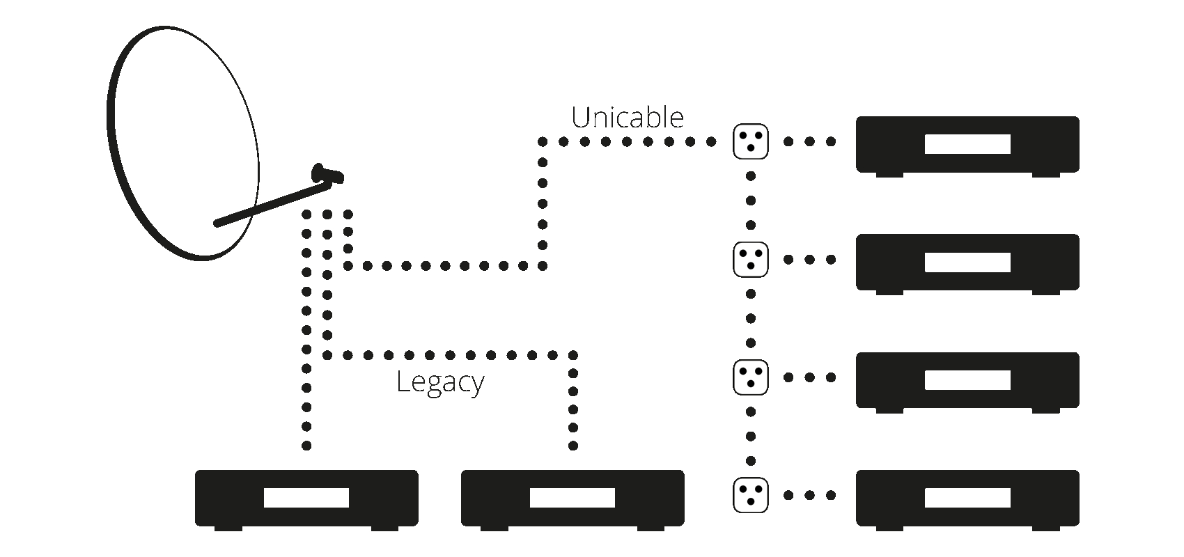 Warunkiem działania takiej instalacji jest posiadanie przez tuner funkcji UNICABLE, która polega na wykorzystaniu do transmisji sygnału 4 częstotliwości: