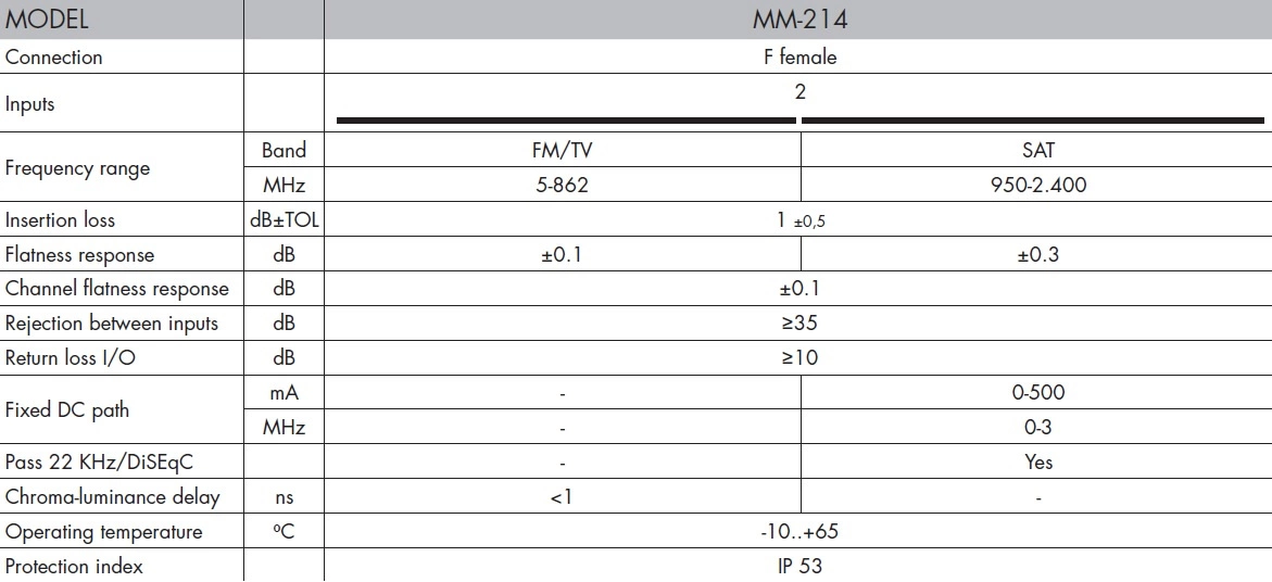 Model MM-214 sumuje sygnały typu: SAT z LNB Single + DVB-T. Całość jest podawana dalej na jednym przewodzie koncentrycznym 75 Ohm.