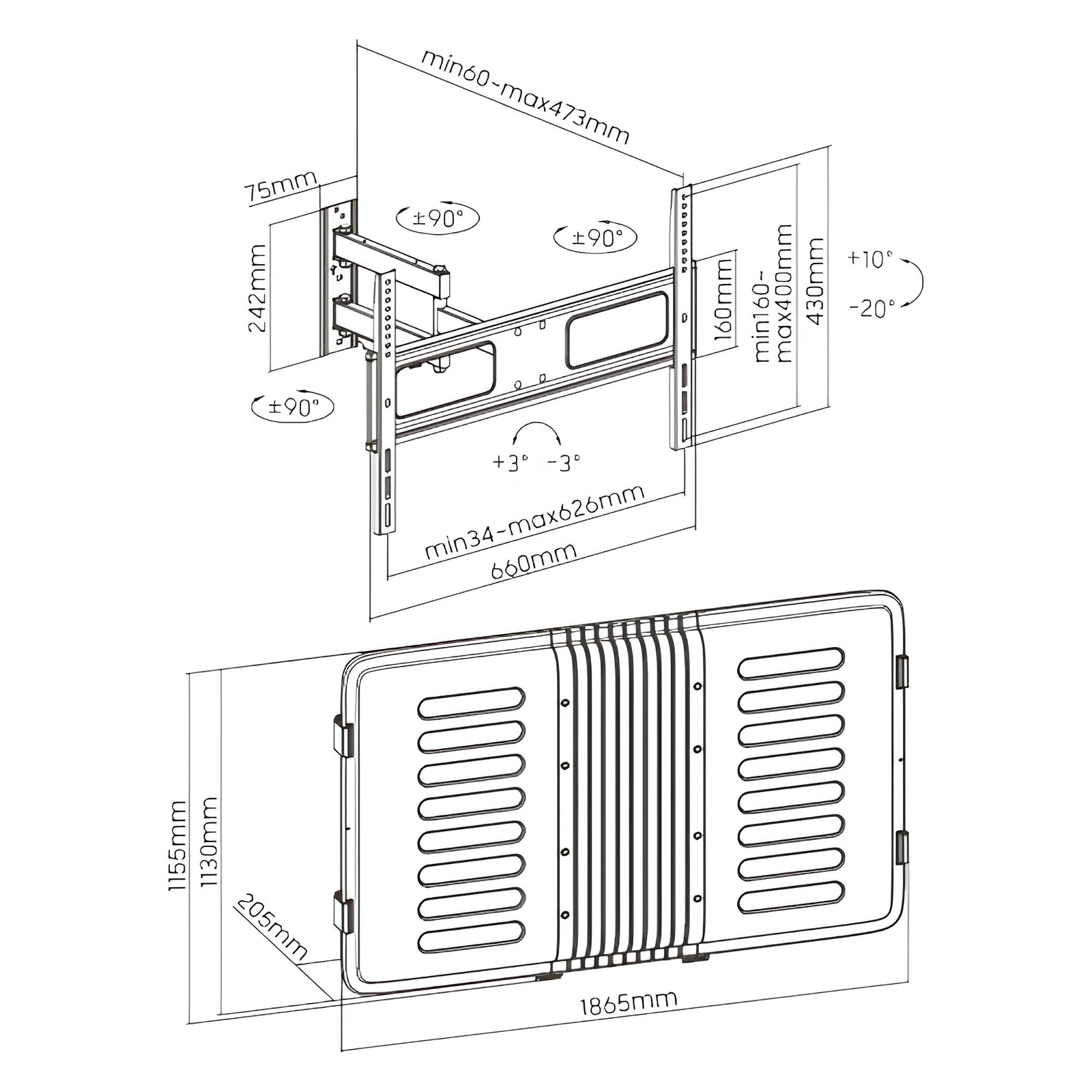 TheSpacetronik SPE-T20_75 TV case fits most TVs between 55 and 75 inches. In addition, it is compatible with the VESA standard 200x200, 300x200, 400x200, 300x300, 400x300, 400x400, 600x400. To give you full freedom from using the device, the screen tilts +10~-20°. You can also rotate it by 90° in both directions. The level, on the other hand, you will set between +3 and -3°.