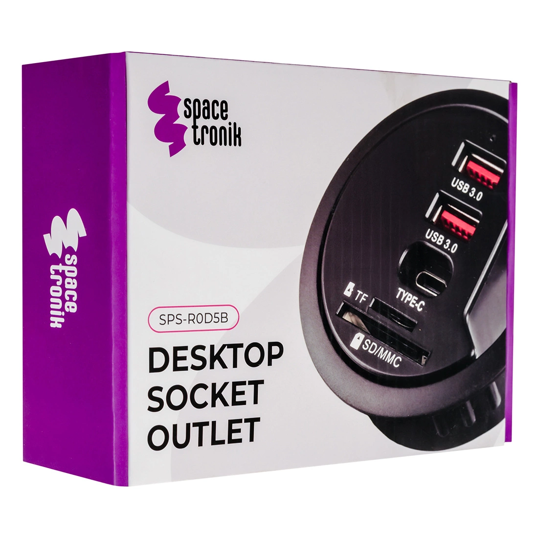 Mediaport Spacetronik ERGOLINE SPS-R0D5B is a modern solution that is used in stores, showrooms, conference rooms, offices, as well as at home. It is made of high quality components. The product is designed for indoor installation in desks, countertops and tables, both vertically and horizontally, providing access to outlets. This round mediaport is equipped with a USB charger, USB-C charger and SD and TF card slots