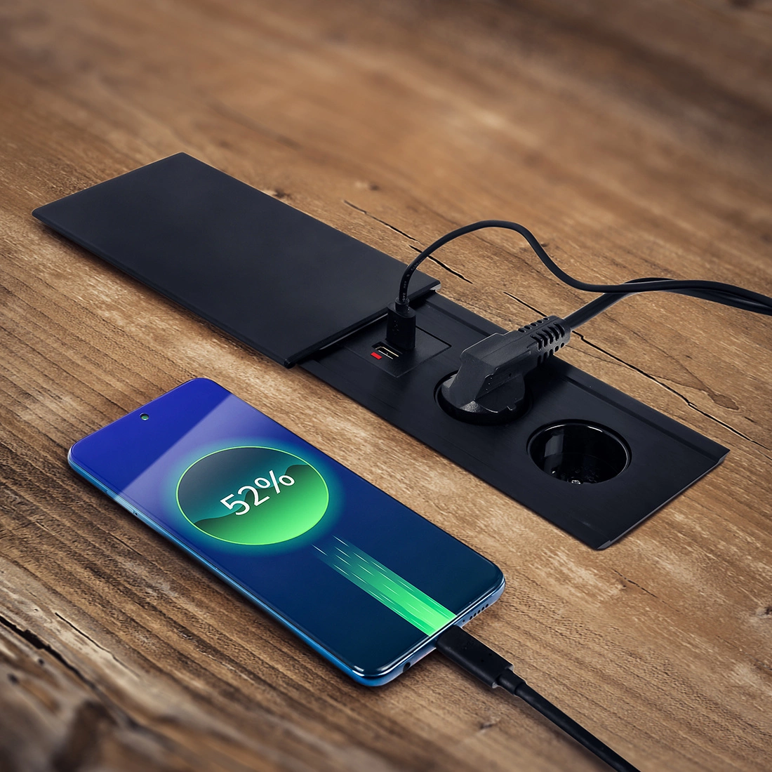 Gniazdo chowane w blat Spacetronik SPS-S24B COMPACT posiada podwójną ładowarkę USB, dzięki której naładujesz swój telefon, tablet i inne urządzenia.