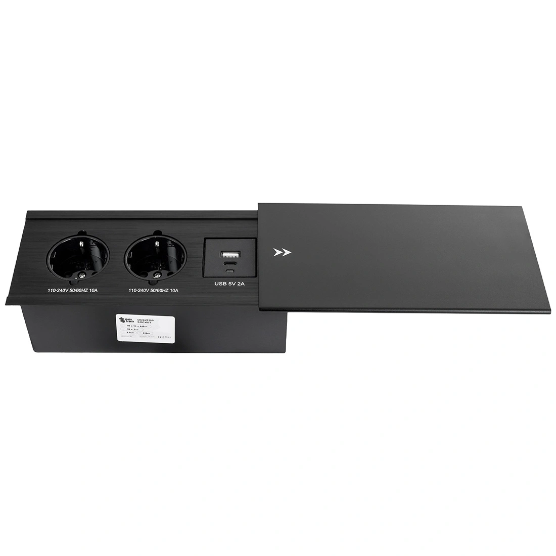 Mediaporty do biurek Spacetronik Ergoline to nowoczesne rozwiązanie, które znajduje zastosowanie w sklepach, salonach sprzedaży, salach konferencyjnych, biurach, a także w domu. Model Spacetronik SPS-S24CB V2 COMPACT to mniejsza wersja podstawowego modelu. Gniazdo meblowe zostało wykonane z aluminium i wysokiej jakości komponentów. Produkt jest przeznaczony do montażu wewnątrz pomieszczeń w biurkach, blatach i stołach. Gniazdo wpuszczane jest wyposażone w 2 gniazda zasilające Schuko 110-250 V (niemieckie/bez bolca) oraz podwójną ładowarkę USB - jeden port USB-C oraz USB-A.