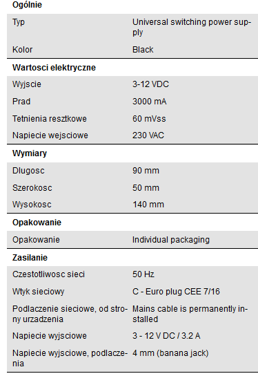 • Tabletop switching power supply with adjustable output voltage: 3,0/4,5/6,0/7,5/9,0/12 V. 3A current