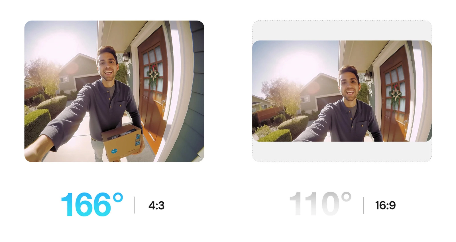 Most competing video intercoms implement a camera with the popular 16:9 aspect ratio, which is a popular format for video recording. However, the viewing angle is limited to only 110 degrees. That's why the Aosu Video Doorbell Pro SL-V8P uses a 4:3 aspect, providing a field of view, up to 166 degrees. That is, 56 degrees more than most competing video doorbells. As a result, any person standing in front of it will show you in all their glory. From head to toe.