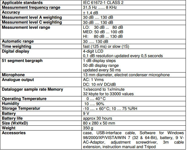 • Professional sound pressure level meter with data logger and USB interface 30-130dB