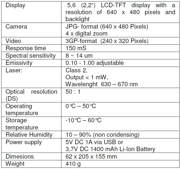 Profesjonalne termometr z funkcją podczerwieni i podwójnym pomiarem laserowym dla dokładnego określania celu pomiarów środowiskowych. Szybki, dokładny i bezdotykowy. Urządzenie jest wyposażone w dodatkowe wejście typu K i przygotowane na pomiar kontaktowy. Dzięki wbudowanej funkcji zdjęć, wyświetlacz może pokazywać mierzony obiekt wraz z wyświetlaniem temperatury i innych danych, takich jak wilgotność i temperatura punktu rosy. Wyniki pomiarów są zapisywane w pamięci wewnętrznej lub na włożonej karcie MicroSD. Zintegrowany rejestrator danych przechowuje wszystkie pomiary, które mogą być edytowane i porównywane z komputerem. Idealny do dokumentowania ważnych danych pomiarowych w dziedzinie przemysłowej, elektrotechnicznej, czynnościach serwisowych, kontroli jakości, budownictwie energooszczędnym i konsultacjach.