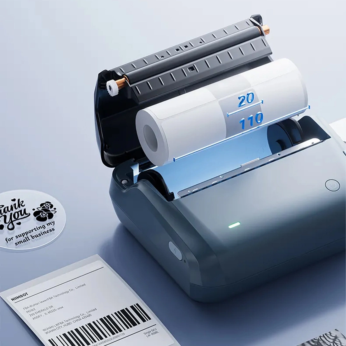 Niimbot B4 ma wbudowaną komorę, która mieści pełną rolkę etykiet 4×6" (100×150 mm). Dzięki temu drukarka zajmuje nawet o 50% mniej miejsca niż klasyczne modele biurkowe. To świetna opcja, jeśli pracujesz w małym magazynie, prowadzisz wysyłki z domu albo chcesz mieć drukarkę pod ręką na niewielkim biurku. W praktyce oznacza to porządek, mniej kabli i brak luźno latających rolek.