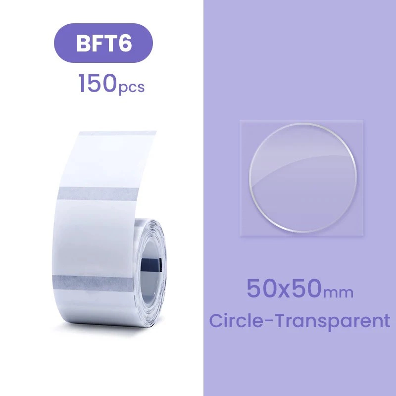 Etykiety do drukarek Niimbot z serii B transparentne. Na rolce znajduje się 150 sztuk w kształcie kółek o średnicy 50mm.