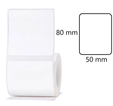 Etykiety do drukarek Niimbot z serii B w kolorze białym. Na rolce znajduje się 95 sztuk w rozmiarze 50x80mm. Etykiety w pozycji wertykalnej (pionowej).