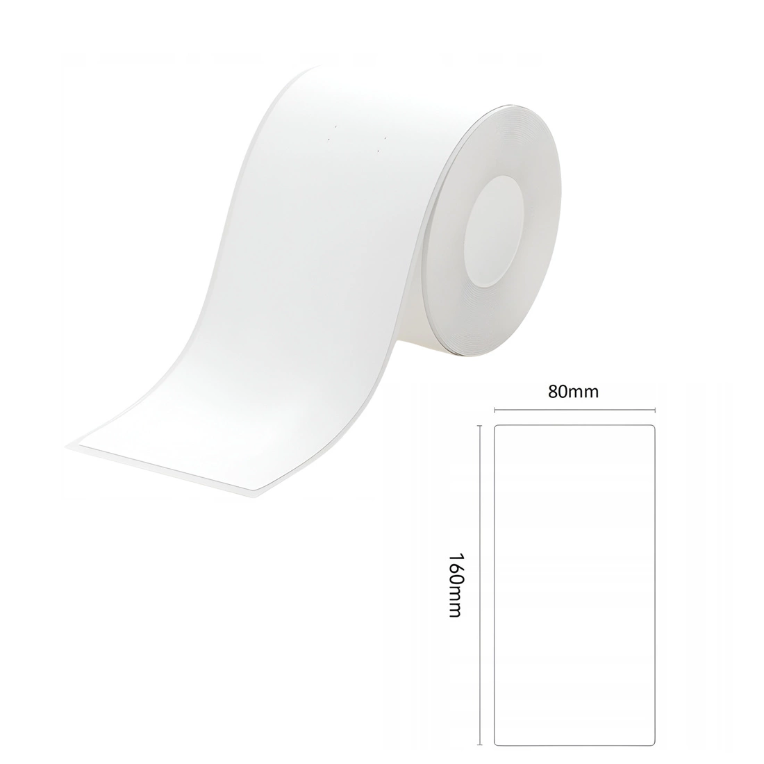 Etykiety do drukarek Niimbot z serii K w kolorze białym. Na rolce znajduje się 160 sztuk w rozmiarze 80x160 mm. Etykiety w pozycji wertykalnej (pionowej).
