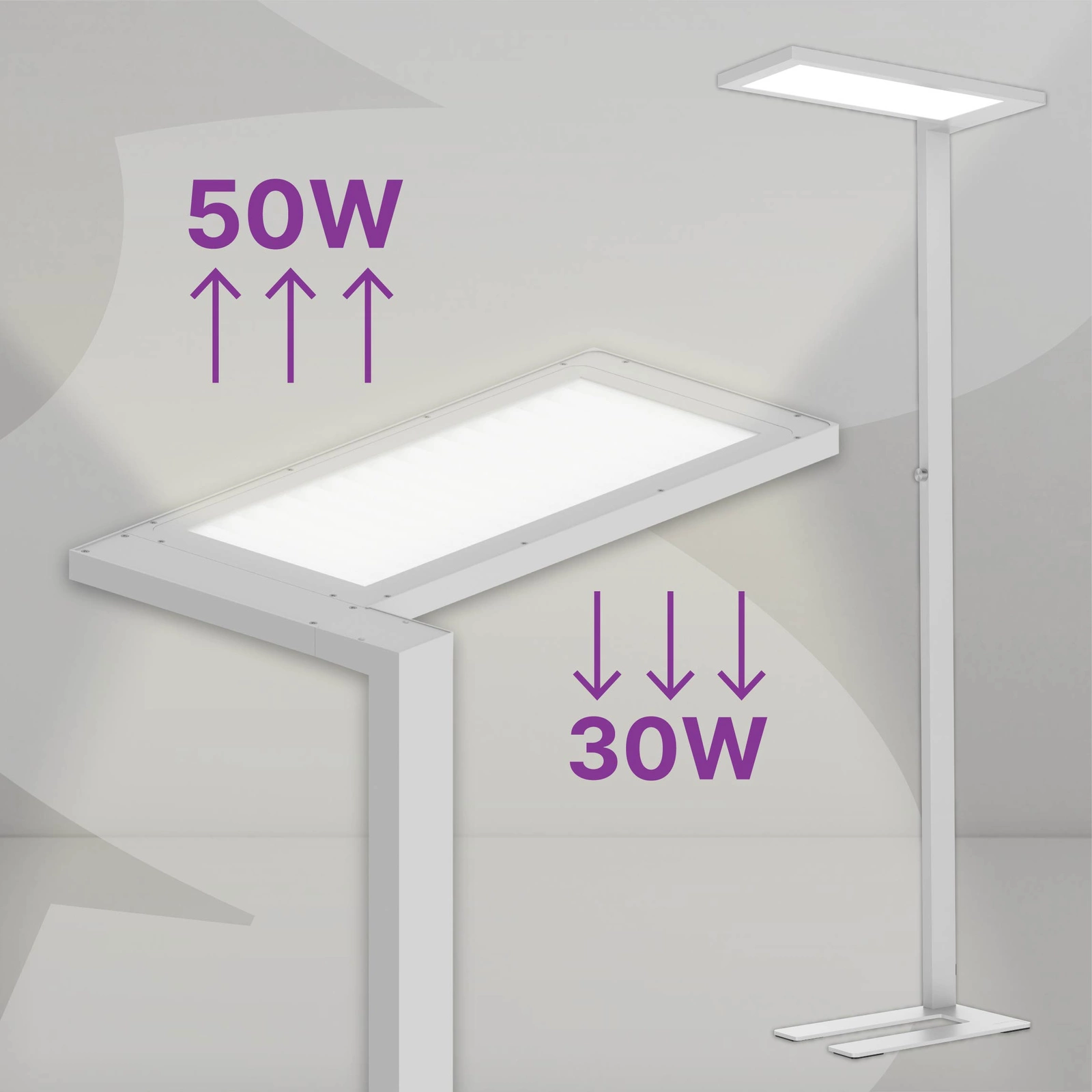 • Lampa podłogowa LED Spacetronik GLOW D24 - mobilne oświetlenie biurowe o mocy 80W, barwie światła 4000K i CRI Ra większe równe 90. Posiada pokrętło ściemniające i asymetryczne światło, idealna do biur, gabinetów i sal konferencyjnych.