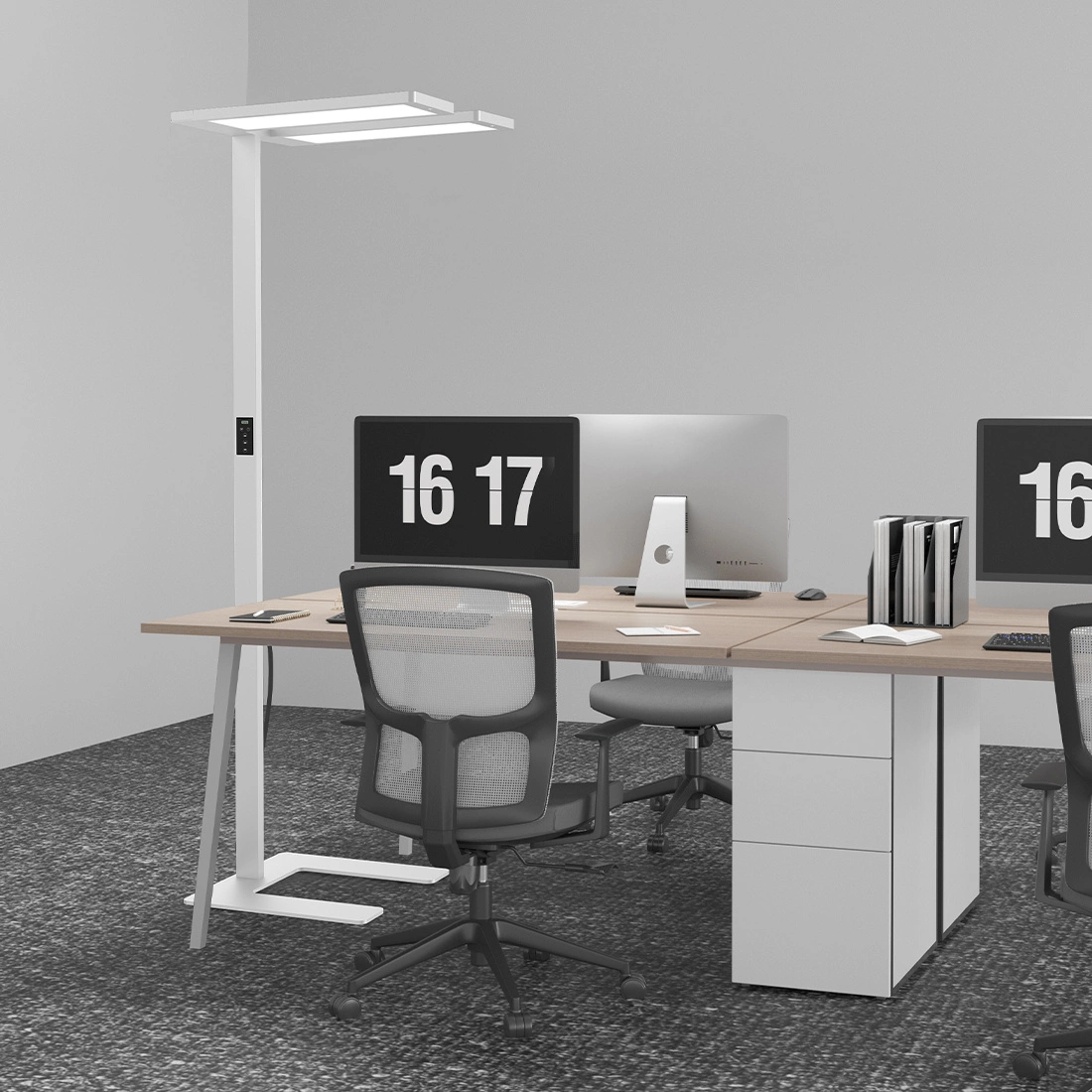 Jako wolnostojąca, profesjonalna lampa podłogowa GLOW D24 Pro Auto sprawdza się tam, gdzie układ stanowisk zmienia się wraz z potrzebami zespołu. Zwiększasz liczbę biurek lub zmieniasz aranżację? – po prostu dostawiasz lampy, bez wiercenia w suficie i prowadzenia dodatkowych kabli w ścianach.