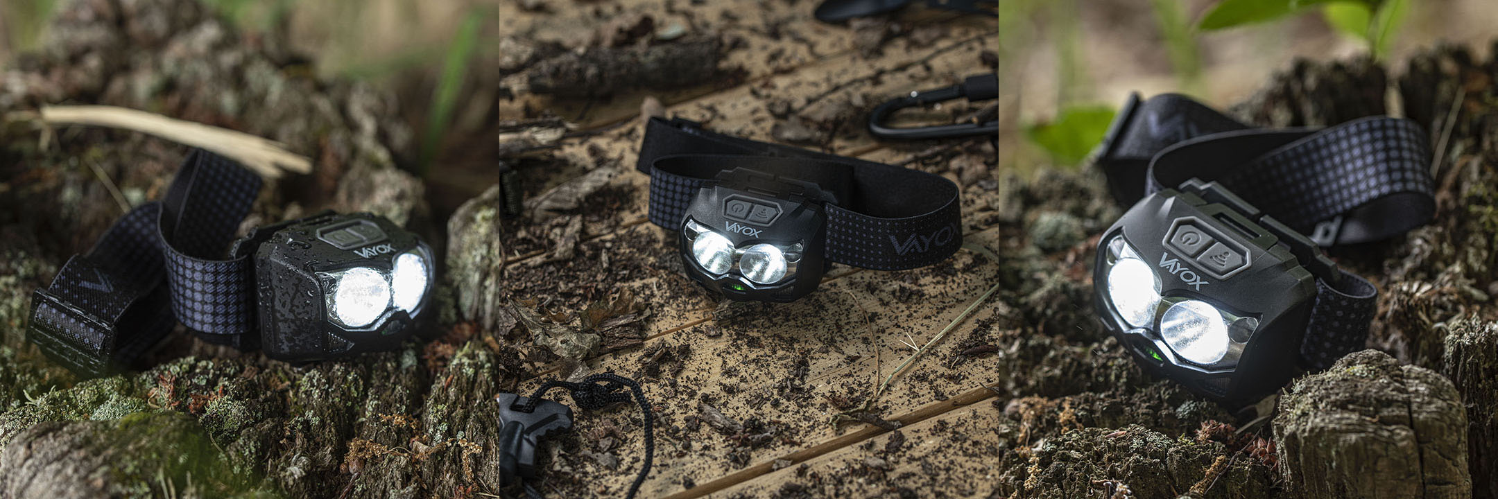 • Latarka czołowa Vayox z czujnikiem ruchu i możliwością użycia akumulatora 1200 mAh lub baterii. Moc 500lm, ładowanie USB.
