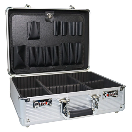 PeakTech 7245 to praktyczna walizka na narzędzia z 13 uchwytami na narzędzia (śrubokręty, klucze, noże, miary) i indywidualnie regulowanymi przegrodami. Ta wysokiej jakości walizka z aluminiową ramą, zamykana jest zamkiem szyfrowym, chroniąc Twoje narzędzia i elektroniczne urządzenia pomiarowe przed wszelkimi uszkodzeniami podczas podróży lub w drodze do pracy. Za zdejmowanym uchwytem na narzędzia w pokrywie walizki znajduje się miejsce na teczki i dokumenty w formacie A4, dzięki czemu również Twoje ważne dokumenty mogą być bezpiecznie transportowane. Oprócz stabilnej konstrukcji ze wzmocnionymi krawędziami i zaokrąglonymi rogami, ten futerał ma cztery gumowe nóżki w dolnej części, co zapewnia solidną podstawę.
