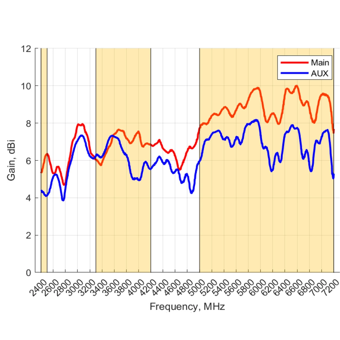 | Zysk (maks.) | 6,5 dBi @ 2400–2500 MHz 7,8 dBi @ 3300–4200 MHz 10 dBi @ 4900–7200 MHz |