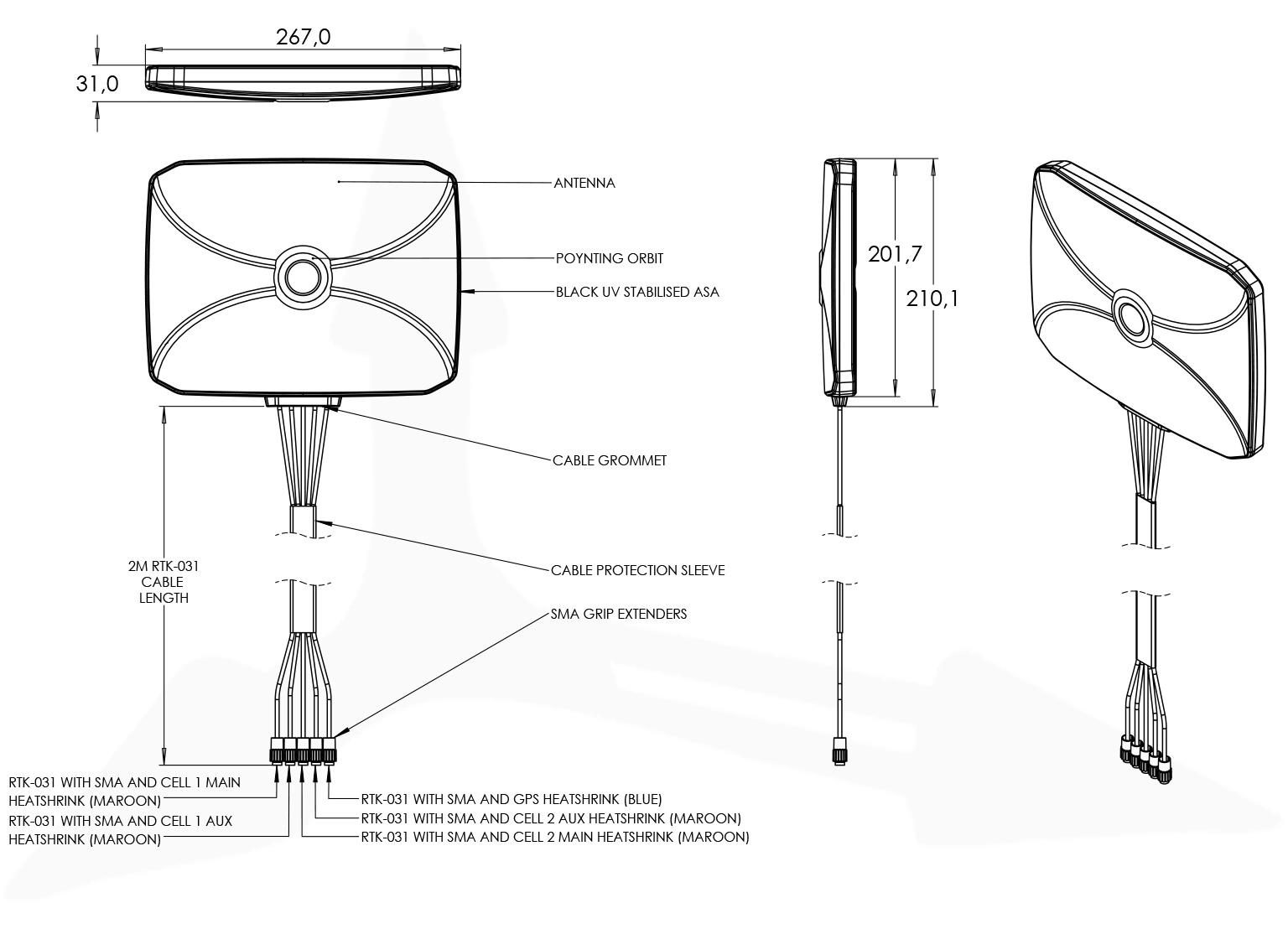 przewodów RTK-031 (2 m, SMA M) oraz montaż na przyssawki i taśmy Velcro.