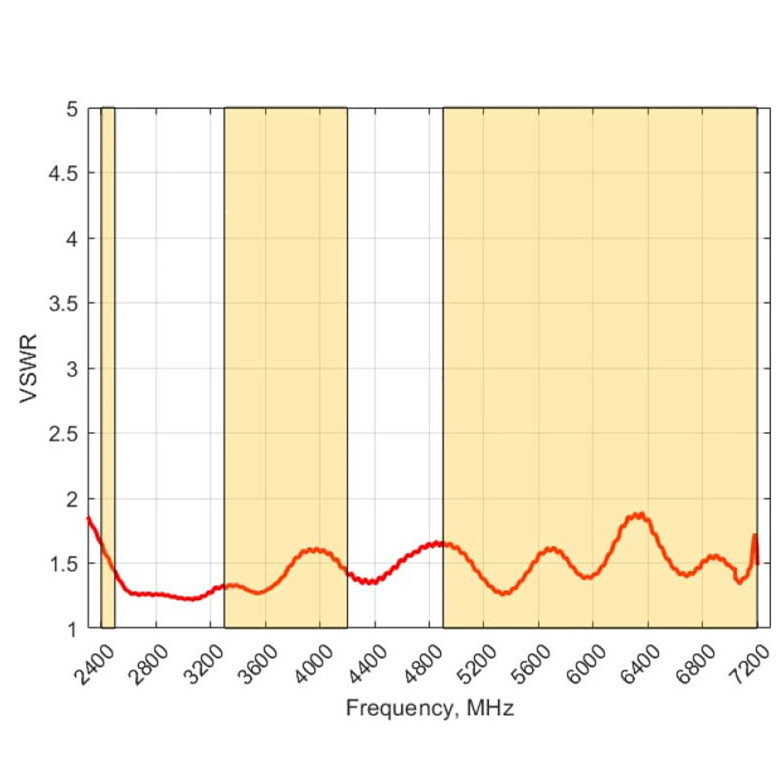 2400–2500 MHz (Wi-Fi 2.4 GHz) 3300–4200 MHz (5G, 3.4–3.8 GHz) 4900–7200 MHz (Wi-Fi 5 / Wi-Fi 6E) |
