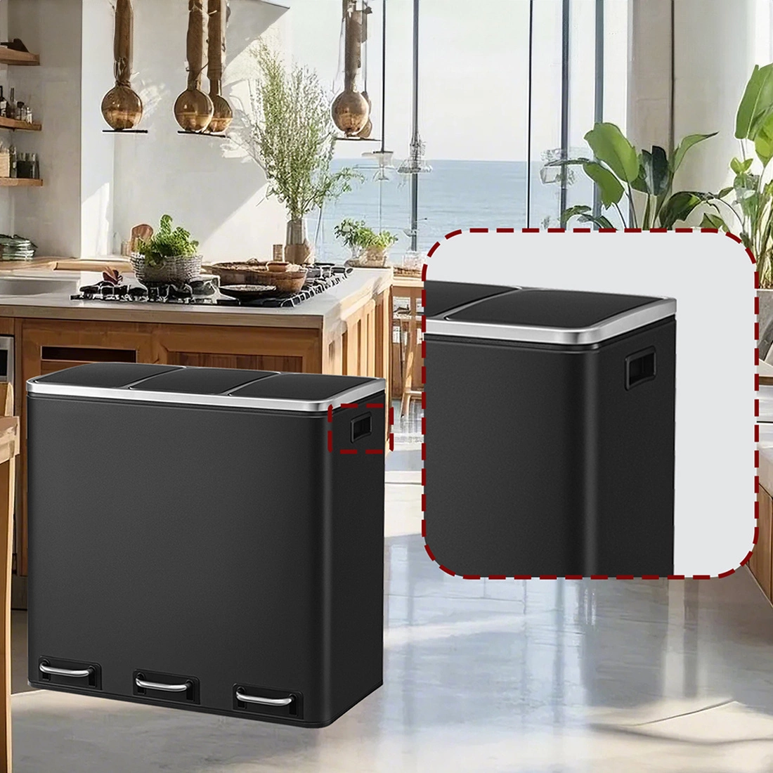 - Potrójna komora: Umożliwia łatwą segregację śmieci i recyklingu dzięki trzem oddzielnym pojemnikom.