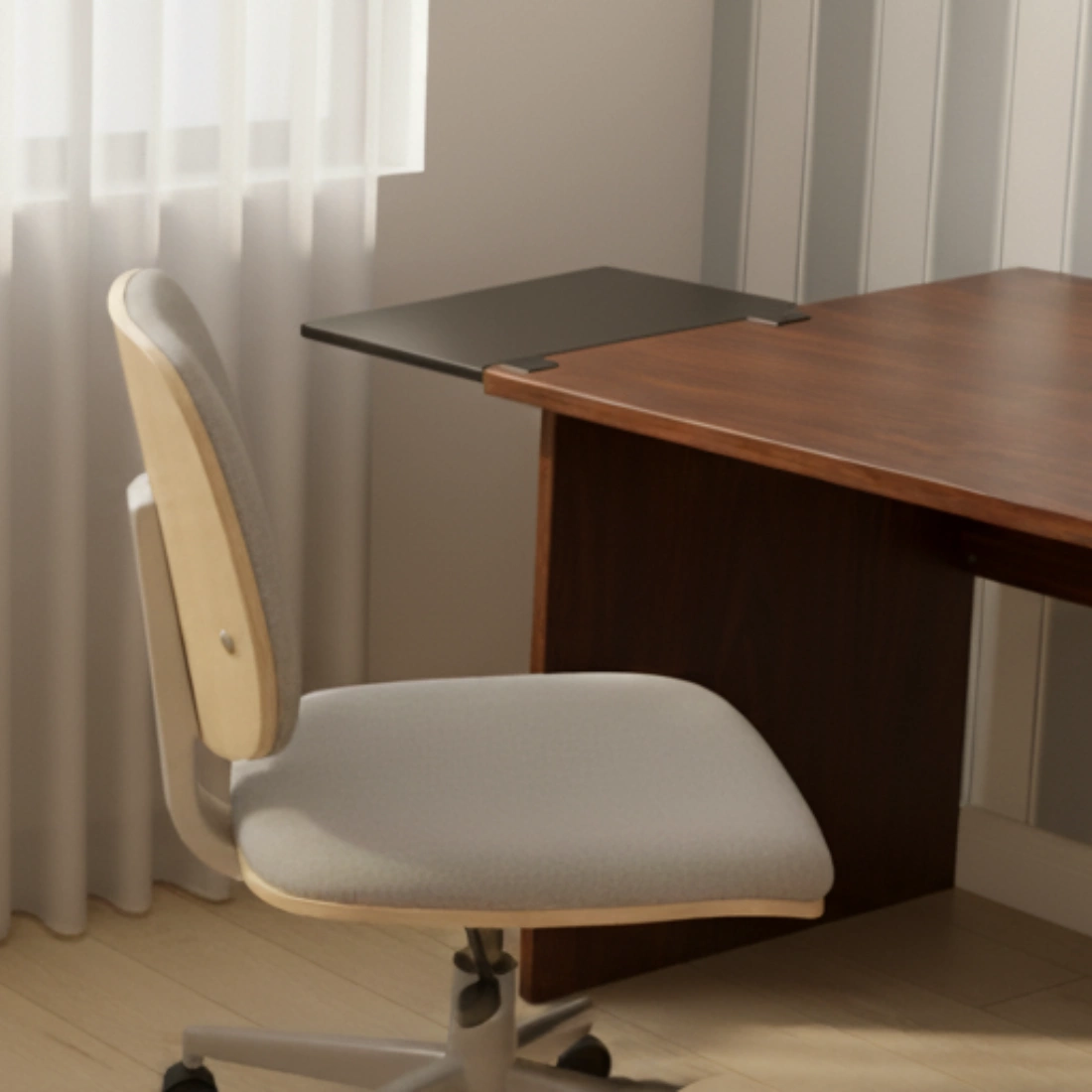 Beznarzędziowy system dwóch stalowych zacisków z pokrętłami pozwala zamontować dostawkę w mniej niż minutę. Przyłóż do krawędzi blatu, dopasuj zaciski, dokręć — i gotowe. Zakres wysunięcia przedłużki względem krawędzi biurka wynosi około 0–11 cm, a po złożeniu blat odstaje od krawędzi biurka o około 4 cm (około 9 cm licząc od końca stopki montażowej).