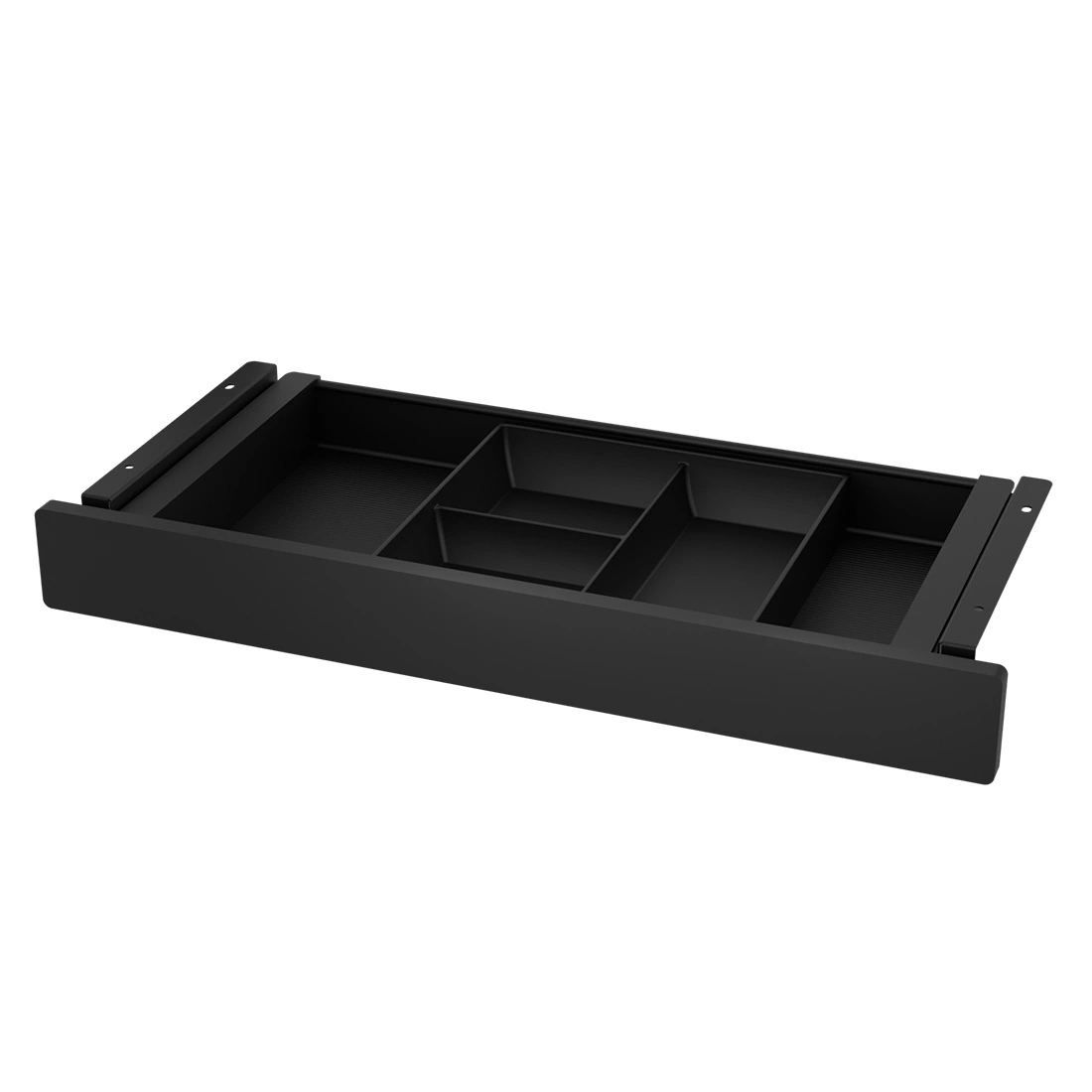 Czarna szuflada montowana pod biurkiem, wykonana z wytrzymałej stali i polistyrenu. Kompaktowe wymiary i liczne przegródki pozwalają uporządkować wszystkie biurowe drobiazgi bez zajmowania miejsca na blacie.