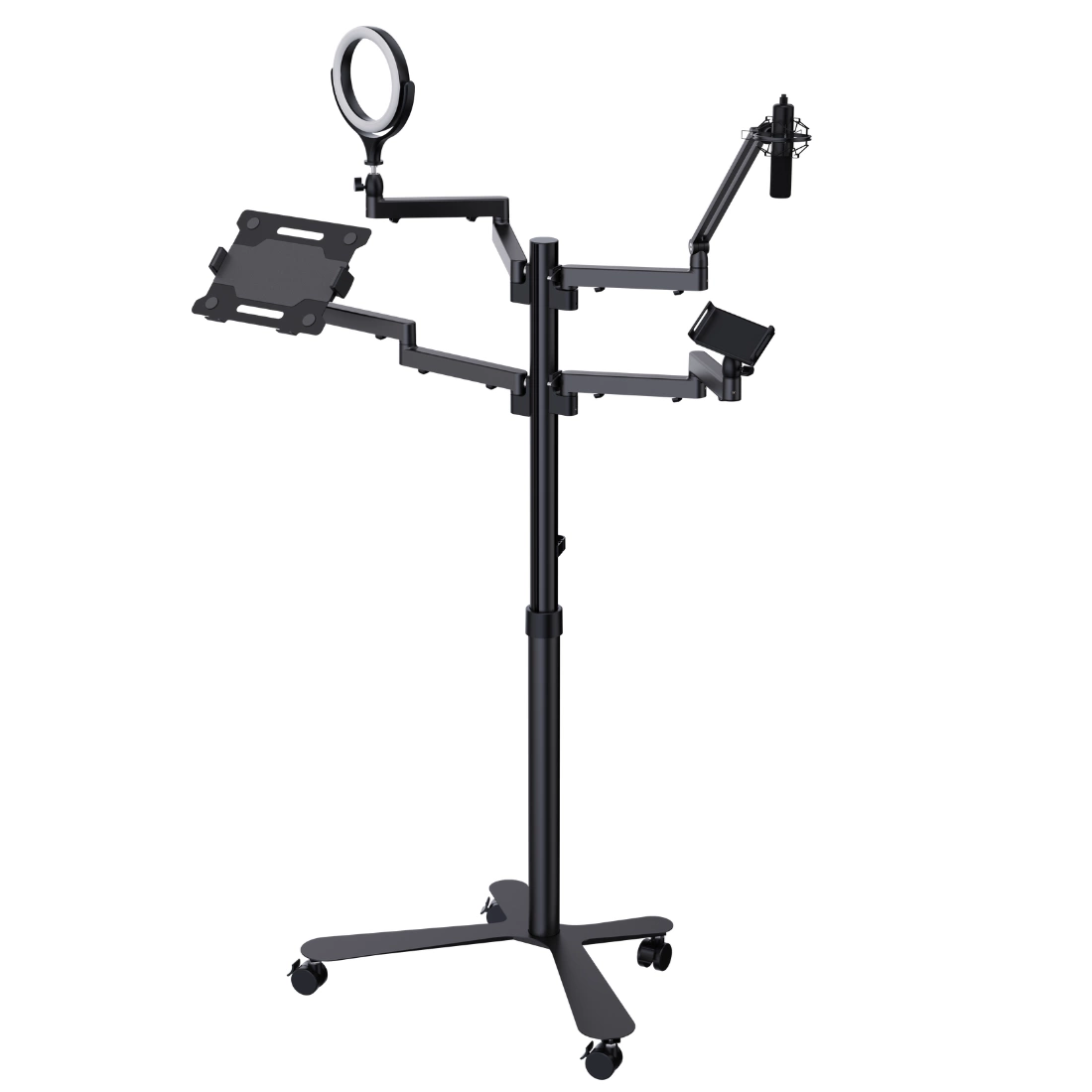 – Regulacja wysokości 83,6–134 cm, możliwość montażu telefonu, tabletu i laptopa (uchwyt na tablet 25 cm, uchwyt na laptopa 41 cm), centralizacja sprzętu i stabilne studio bez drgań