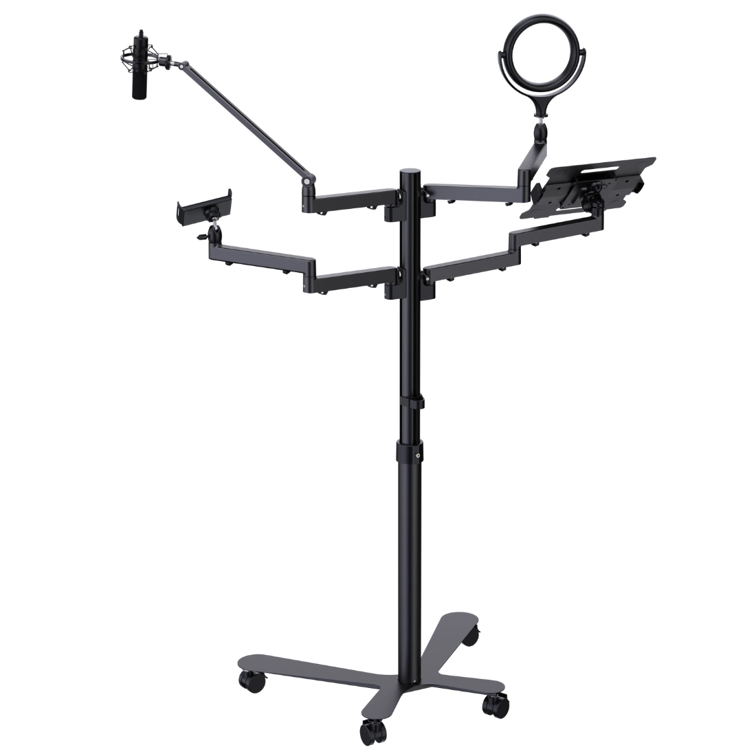 Zawartość zestawu: Podstawa statywu, ramię teleskopowe, ramię na mikrofon 36 cm, głowica kulowa 1/4″, uchwyt na telefon, uchwyt na tablet (25 cm), uchwyt/półka na laptopa (41 cm), lampka, zestaw kluczy montażowych, instrukcja obsługi (mikrofon nie znajduje się w zestawie)